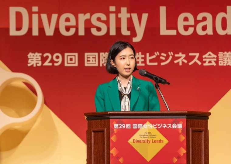 "The purpose of diversity is to bring together the power of individuals to achieve greater results. It is meaningless to just have diverse people present. The goal is to work together to create a positive impact. To that end, management and human resources create a supportive system, but the bottom line is the actions of the individuals. Each of us needs to present our individuality in a way that is easy for others to accept so we can collaborate with them and create better outcomes," "Today’s conference is no different; it’s up to you to connect with others and to learn from the wisdom of our speakers. With full hearts and open minds, let’s all commit to making this a wonderful day." The room filled with enthusiastic applause. The first keynote speech was given by a speaker that made a life-changing connection 10 years ago. When Ms. Hinako Kijima participated in the ICWB as a high school student with the support of a Matching Sponsor in 2015, she promised herself, "I will be a speaker at this conference in 10 years!" (In the Matching Sponsor program, young people write an essay in hopes of being selected by a Sponsor who will pay their registration fee.) Currently, she works in international finance at the Bank of Japan. The 27-year-old said that when Kaori Sasaki suggested that she give a keynote speech at the opening, she said, "If they were the role models I admired at that time, I would say yes at a time like this, so I said yes." Fulfilling her vow to herself, she stood proudly on the stage and delivered a powerful message and proposed concrete actions to "accept the baton of courage and use your strength to pass it on to the next generation". Everyone in the hall was moved by her passion.